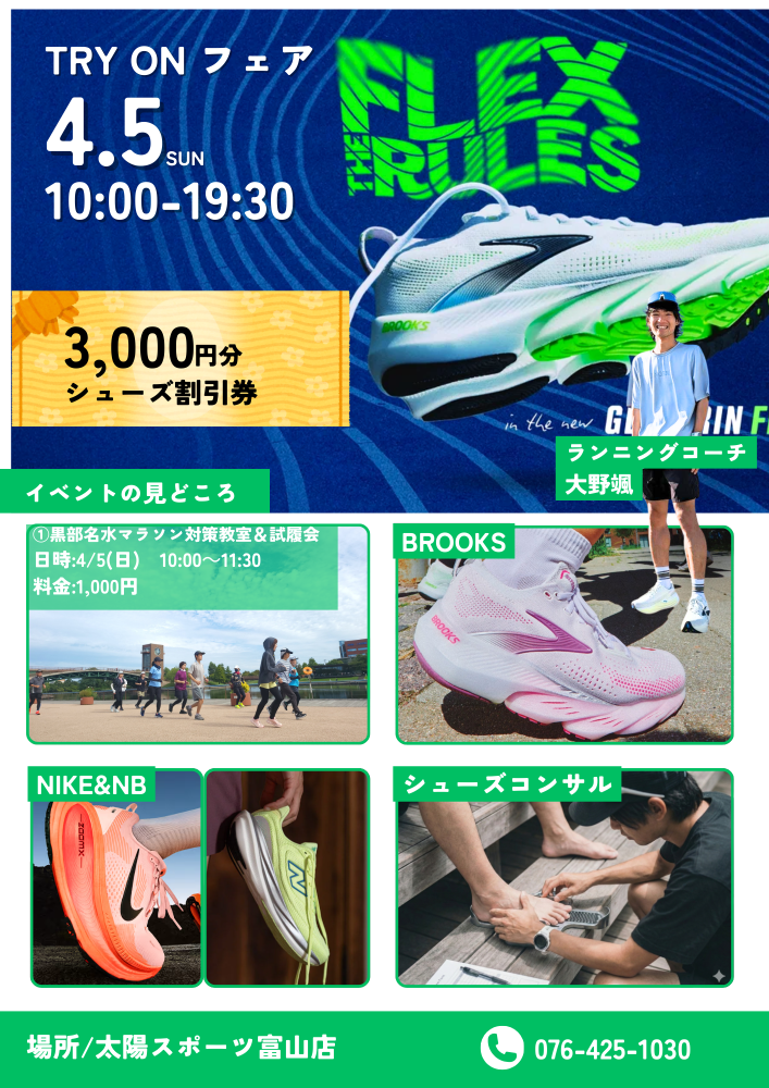 そんなランナーの悩みを解決するため、太陽スポーツとプロランニングコーチ・大野颯がタッグを組んだスペシャルイベント「シューズ トライオンWEEKS」を開催します!