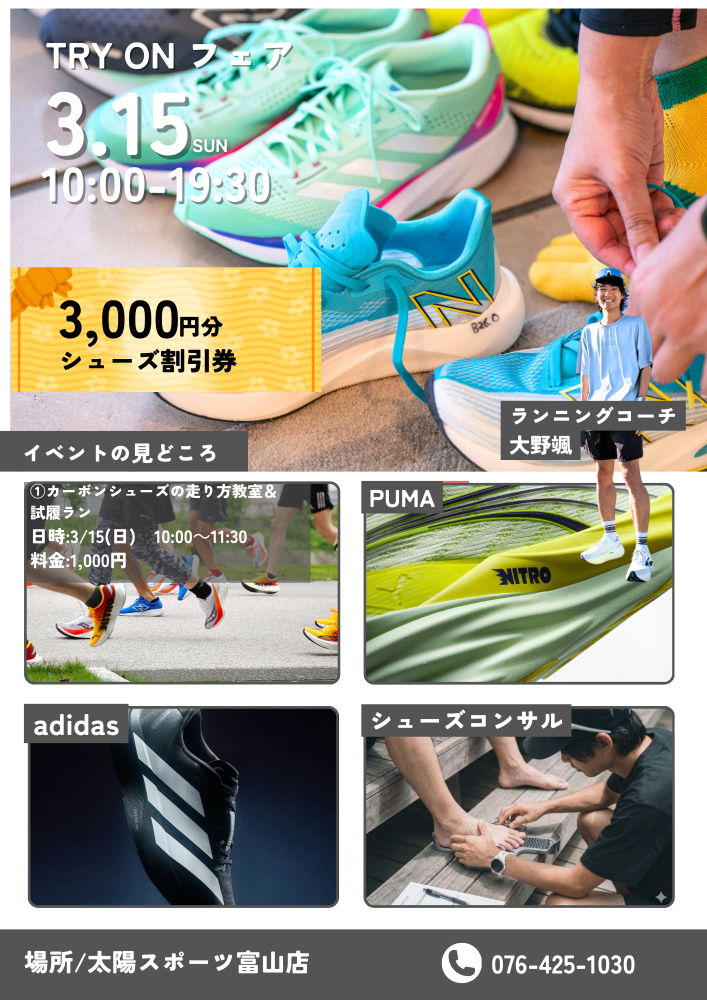・太陽スポーツ富山店でご利用可能なシューズ3,000円割引券プレゼント!