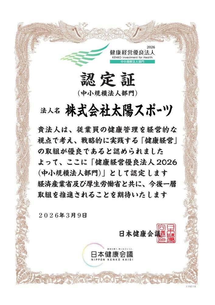 2026年3月9日、株式会社太陽スポーツは、経済産業省および日本健康会議が実施する「健康経営優良法人2026(中小規模法人部門)」に認定されました。2022年の初認定以来、5年連続の認定となります。